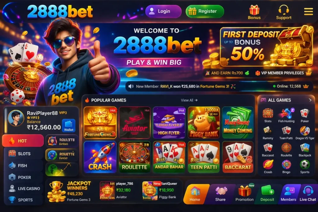 2888Bet Game offers slots, teen patti, aviator, rummy, chicken road, fishing games, color prediction, cricket, and football betting, among others. This variety ensures that every player finds something entertaining and profitable.